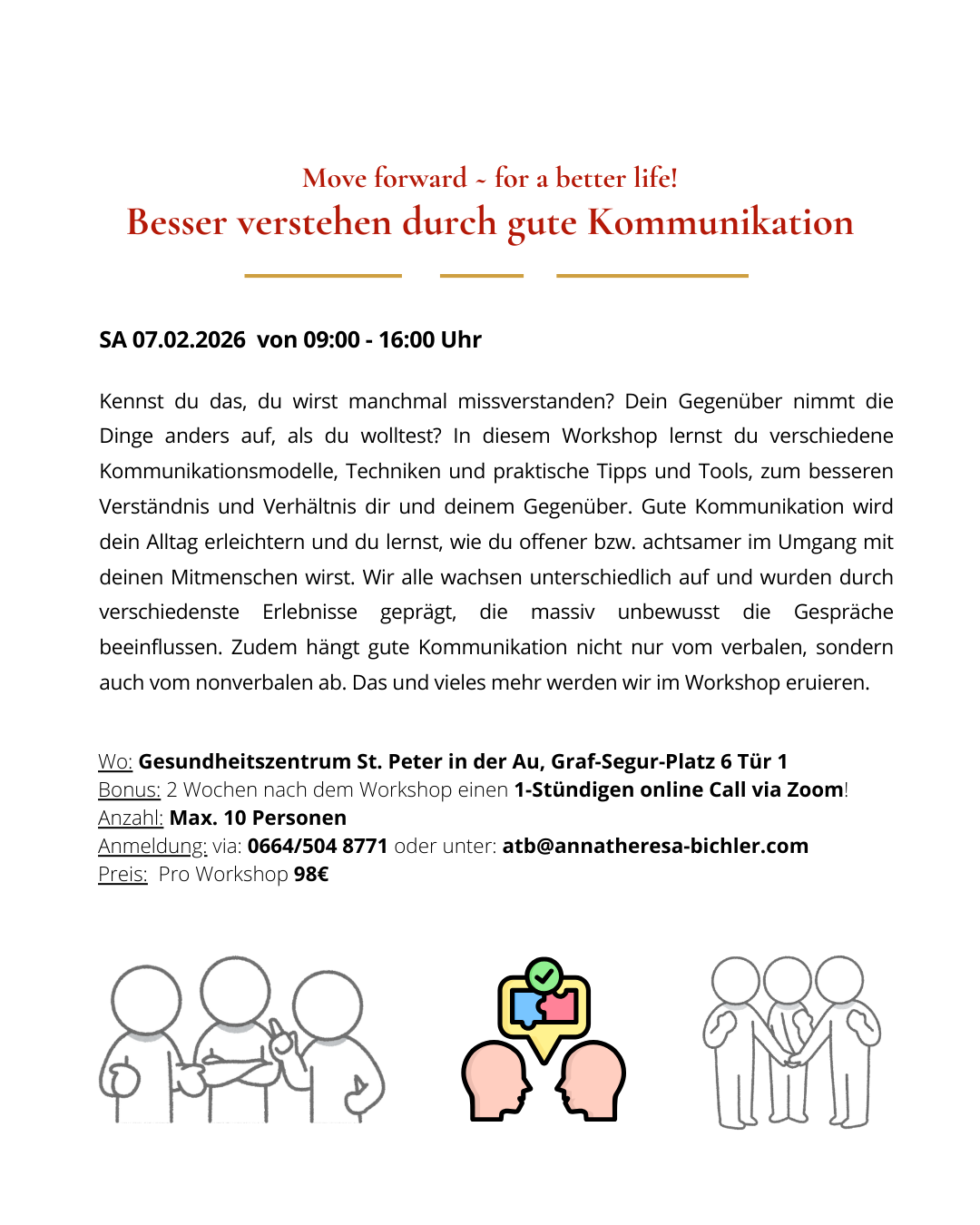 Kennst du das, du wirst manchmal missverstanden? Dein Gegenüber nimmt die Dinge anders auf, als du wolltest? In diesem Workshop lernst du verschiedene Kommunikationsmodelle, Techniken und praktische Tipps und Tools, zum besseren Verständnis und Verhältnis dir und deinem Gegenüber. Gute Kommunikation wird dein Alltag erleichtern und du lernst, wie du offener bzw. achtsamer im Umgang mit deinen Mitmenschen wirst. Wir alle wachsen unterschiedlich auf und wurden durch verschiedenste Erlebnisse geprägt, die massiv unbewusst die Gespräche beeinflussen. Zudem hängt gute Kommunikation nicht nur vom verbalen, sondern auch vom nonverbalen ab. Das und vieles mehr werden wir im Workshop eruieren.