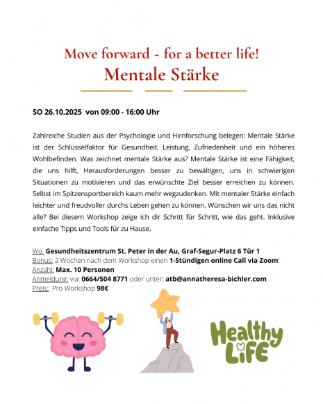 Zahlreiche Studien aus der Psychologie und Hirnforschung belegen: Mentale Stärke ist der Schlüsselfaktor für Gesundheit, Leistung, Zufriedenheit und ein höheres Wohlbefinden. Was zeichnet mentale Stärke aus? Mentale Stärke ist eine Fähigkeit, die uns hilft, Herausforderungen besser zu bewältigen, uns in schwierigen Situationen zu motivieren und das erwünschte Ziel besser erreichen zu können. Selbst im Spitzensportbereich kaum mehr wegzudenken. Mit mentaler Stärke einfach leichter und freudvoller durchs Leben gehen zu können. Wünschen wir uns das nicht alle? Bei diesem Workshop zeige ich dir Schritt für Schritt, wie das geht. Inklusive einfache Tipps und Tools für zu Hause.