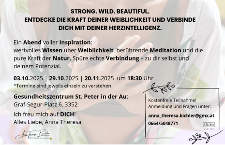 Ein Abend voller Inspiration: wertvolles Wissen über Weiblichkeit, berührende Meditation und die pure Kraft der Natur. Spüre echte Verbindung – zu dir selbst und deinem Potenzial. 03.10.2025 | 29.10.2025 | 20.11.2025 um 18:30 Uhr *Termine sind jeweils einzeln zu verstehen Kostenfreie Teilnahme! Anmeldung und Fragen unter: anna_theresa.bichler@gmx.at 0664/5048771 Gesundheitszentrum St. Peter in der Au: Graf-Segur-Platz 6, 3352 Ich freu mich auf DICH! Alles Liebe, Anna Theresa