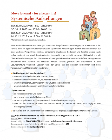 Manchmal fühlen wir uns in schwierigen Situationen festgefahren: in Beziehungen, am Arbeitsplatz, in der Familie, oder im eigenen Gedankenkarussell. Systemische Aufstellungen machen diese Situationen auf einer anderen Perspektiven sichtbar. Vergangene Situationen, Gedanken und Gefühle werden nach außen verlagert und durch Repräsentanten dargestellt – so entsteht ein neuer Blickwinkel und oft überraschende Lösungen. Fazit: Ressourcen können gestärkt werden, belastende Gefühle, unangenehme Situationen oder Konflikte mit Personen werden sichtbar gemacht und anschließend in eine Lösungsrichtung verändert. Dadurch wird der Stress aus der Situation entnommen und neue Perspektiven und Möglichkeiten entstehen.