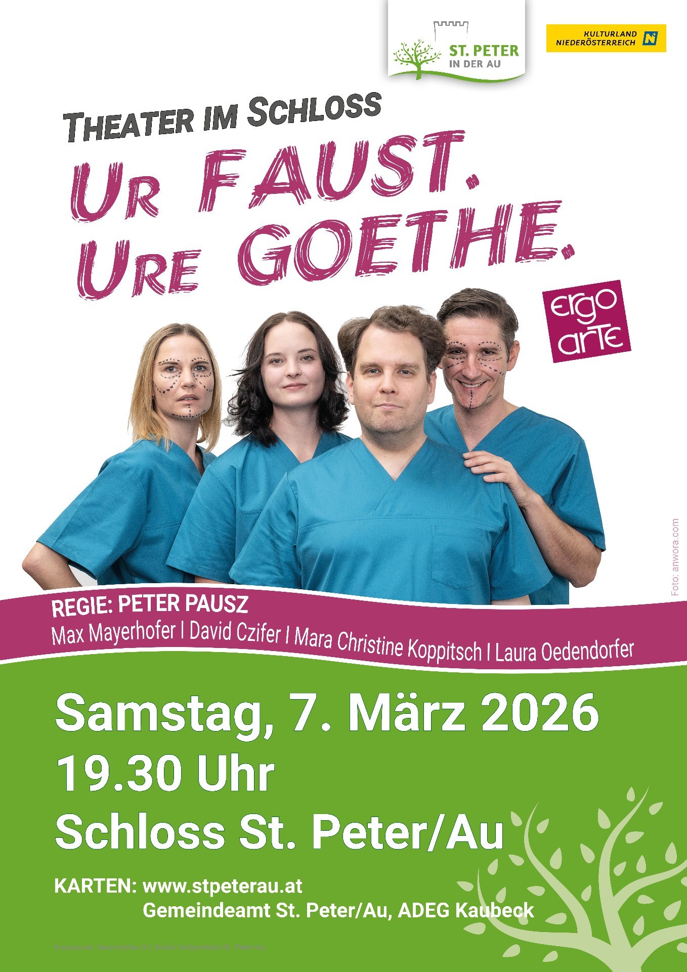 Am 7. März 2026 lädt das Kulturreferat zu einem besonderen Theaterabend ins Schloss St. Peter in der Au ein. Das Ensemble ergo arte bringt Goethes frühen Faust mit frischer Energie, moderner Interpretation und viel Spielfreude auf die Bühne – ein außergewöhnliches Kulturerlebnis für unsere Gemeinde und die ganze Region.